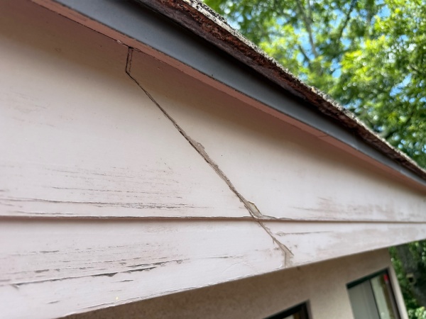 K様邸 外壁塗装工事のご紹介 屋根の重ね葺き工事に合わせて外壁塗装工事も施工させていただきましたのでご紹介させていただきます。 【施工前】 調査を進めていくとクラック(ひび割れ)箇所も多々見られます。 微細なクラックなどはゴムのような弾力性のある下塗り塗料を選定し施工を進めていますのでご安心ください。 こちらは破風板のビフォーアフターになります。 【Before】 【After】 今回は雨どいの交換もさせていただいております。