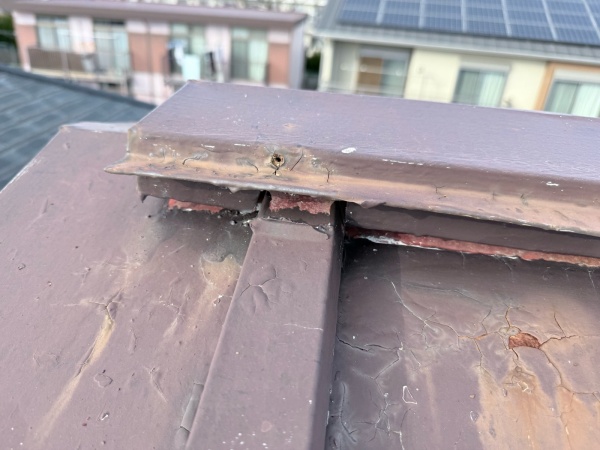 固定するための釘が抜け落ち、棟板金が少し浮いて後ろに傾いている様子が分かるかと思います。